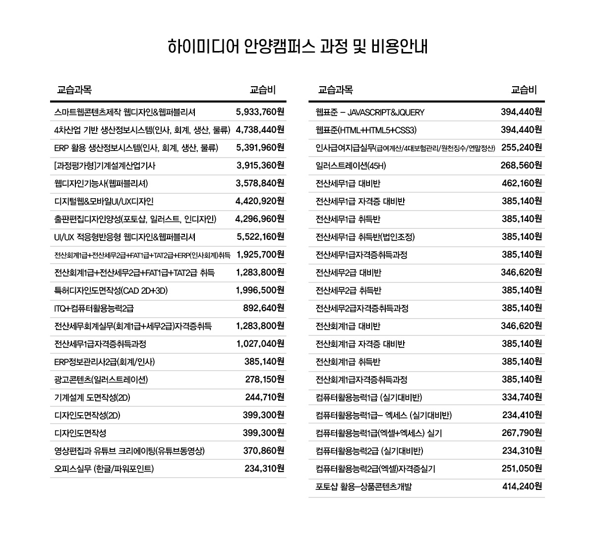 2019 안양캠퍼스 교습비게시표